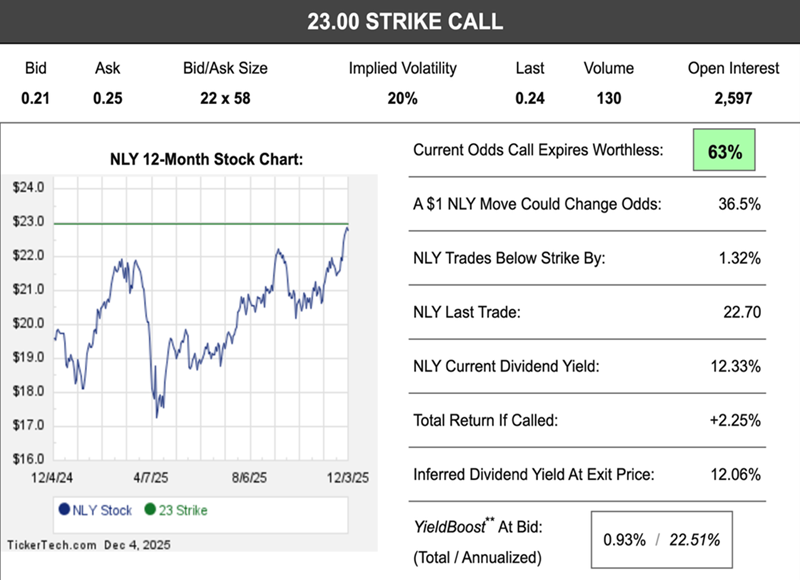 When we sell these options, we receive a 0.9% YieldBoost, which annualizes to 22.5%. And remember, if NLY does rally above its strike price before our option expires, we get to keep a 2.25% total return (a crazy 22.5% annualized!):