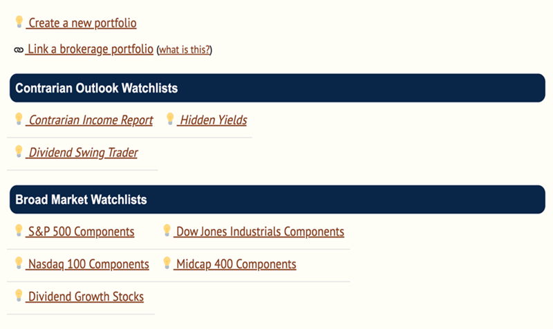 Here, you can also access current Contrarian Outlook watchlists as well as components from key market indices.
