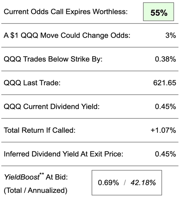 But with OptionSignals, we have a DIY route to mimic these funds! We simply plug an Invesco QQQ Trust Series (QQQ) position into OptionSignals and we’ll again have more potential call-writing strategies. One short-term call option offers a 0.69% “YieldBoost,” annualizing to 42% (sound of your jaw dropping!):