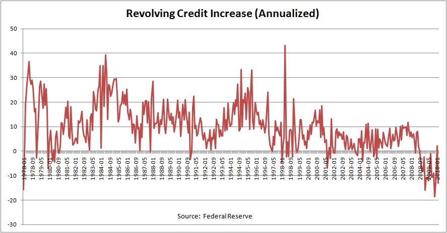 First, we see that consumer credit, as of February 2010, is decreasing at an annual rate of 5.5%: